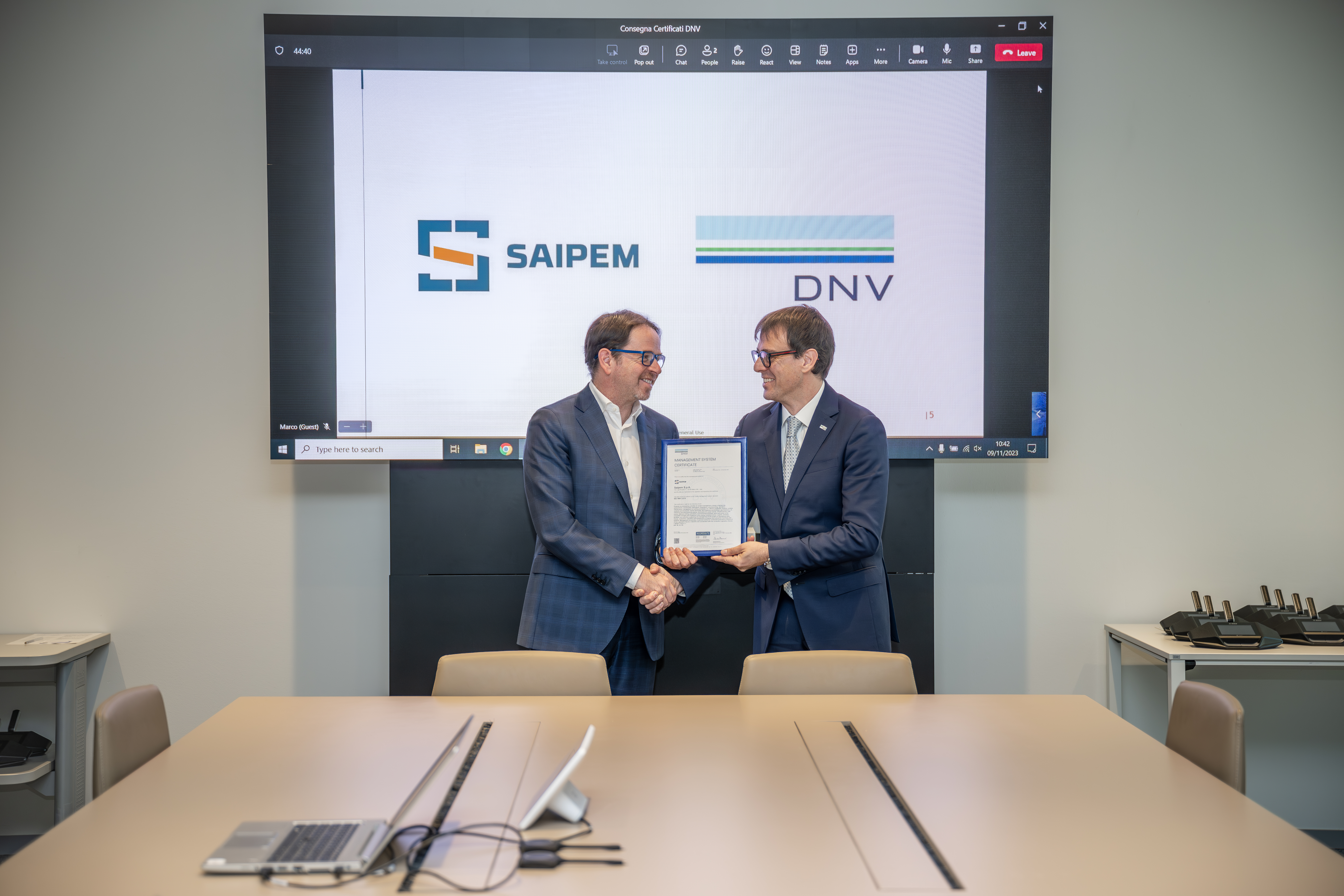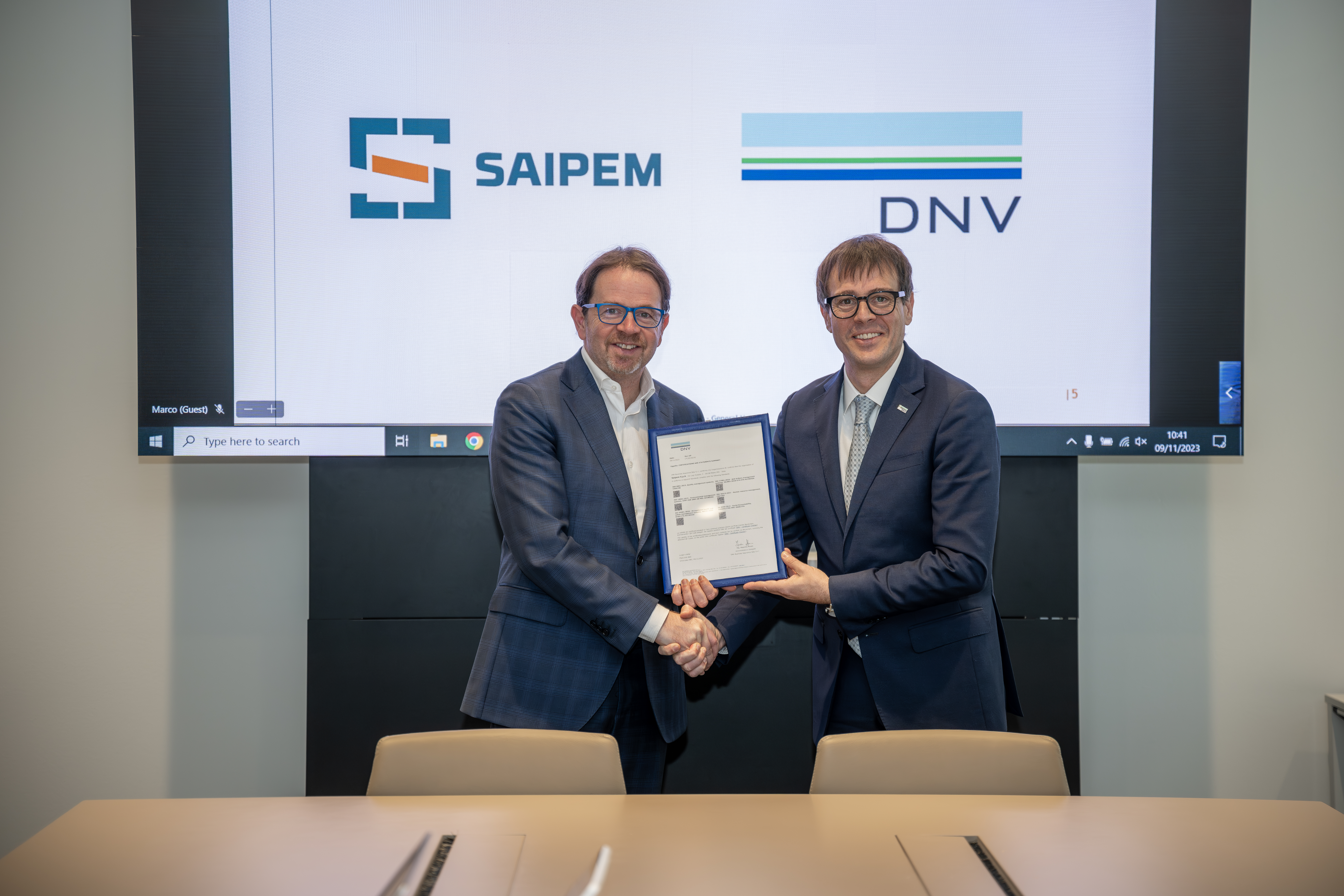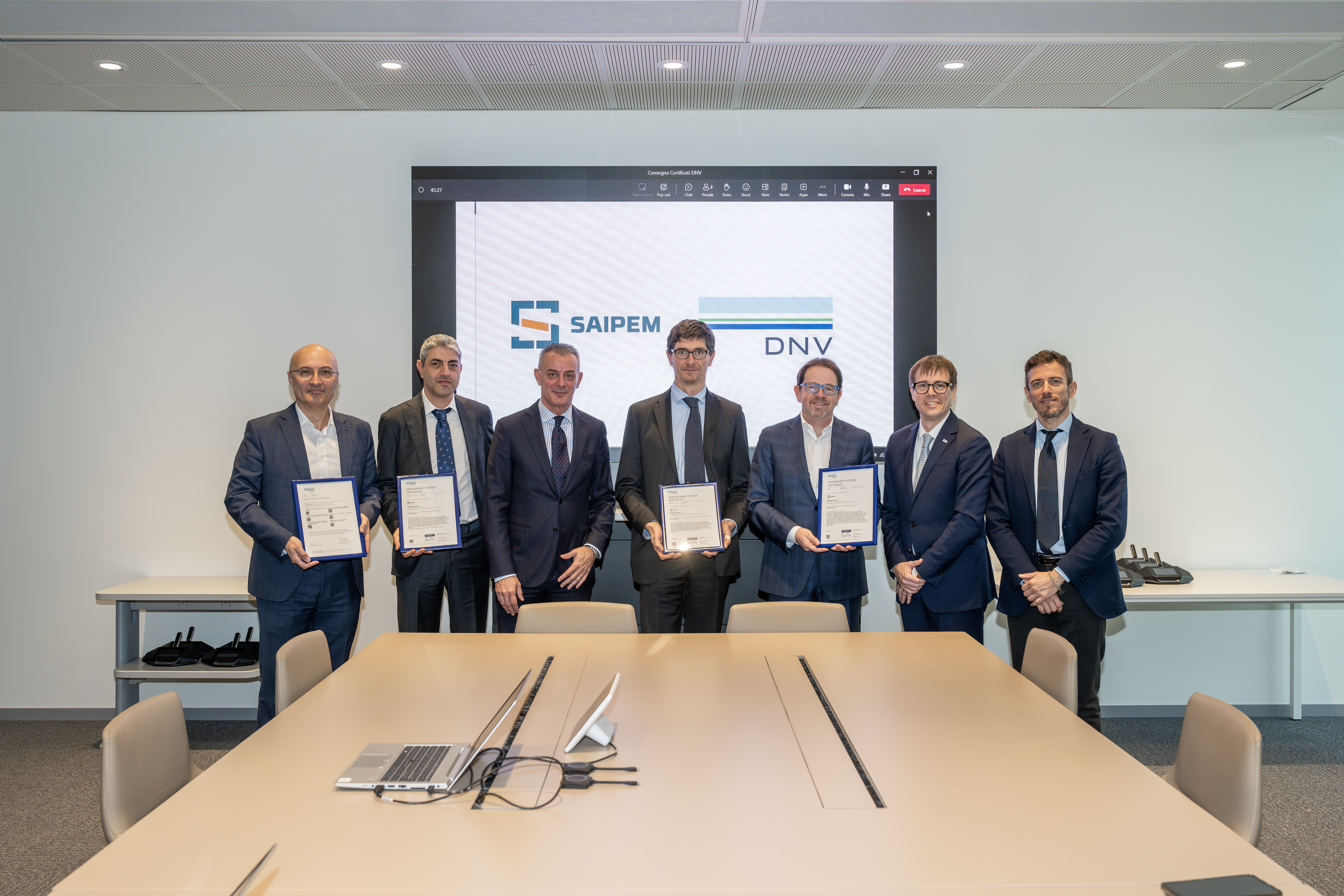 I certificati sono stati consegnati lo scorso 9 novembre dal Managing Director Business Assurance Italy per DNV, Ing. Massimo Alvaro al Chief People, HSEQ and Sustainability Officer dell’azienda, Dott. Massimiliano Branchi, in occasione di una cerimonia tenutasi presso il nuovo headquarter di Saipem a Milano.
